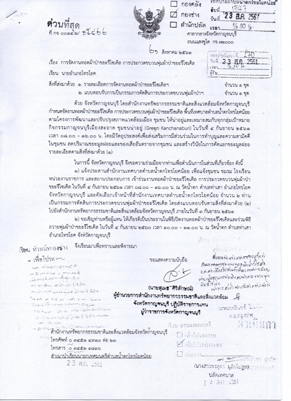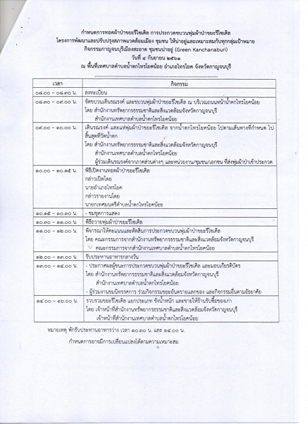 เทศบาลตำบลน้ำตกไทรโยคน้อย ร่วมกับสำนักงานทรัพยากรธรรมชาติและสิ่งแวดล้อมจังหวัดกาญจนบุรี ขอเชิญชวนประชาชนทุกท่านร่วมกิจกรรม "การจัดงานทอดผ้าป่าขยะรีไซเคิล การประกวดขบวนพุ่มผ้าป่าขยะรีไซเคิล" ในวันที่ 4 กันยายน 2561 กิจกรรมเริ่มตั้งแต่เวลา 08.00 น. กำหนดการดังเอกสารด้านล่างค่ะ