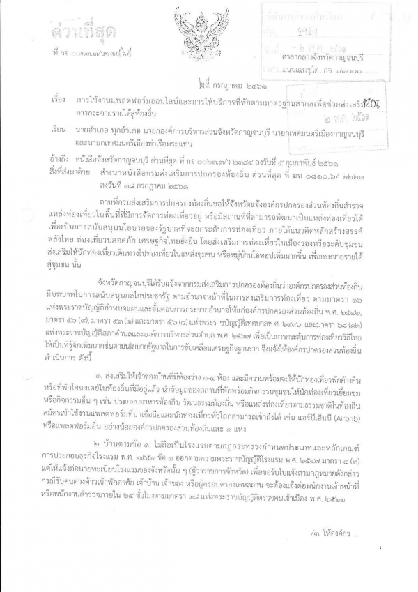 เนื่องด้วยจังหวัดกาญจนบุรีได้แจ้งให้องค์กรปกครองส่วนท้องถิ่นสำรวจแหล่งการท่องเที่ยวในพื้นที่ที่มีการจัดการท่องเที่ยวอยู่ หรือมีสถานที่ที่สามารถพัฒนาเป็นแหล่งท่องเที่ยวได้ เพื่อเป็นการสนับสนุนนโยบายของรัฐบาลที่จะยกระดับการท่องเที่ยว โดยส่งเสริมการท่องเที่ยวในเมืองรองหรือระดับชุมชน ส่งเสริมให้นักท่องเที่ยวเดินทางไปท่องเที่ยวในแหล่งชุมชน หรือหมู่บ้านโอทอปเพิ่มมากขึ้น เพื่อกระจายรายได้สู่ชุมชน โดยเจ้าของบ้านที่สนใจที่มีห้องว่าง 1-4 ห้อง และมีความพร้อมจะให้นักท่องเที่ยวพักค้างคืน หรือที่พักโฮมสเตย์ สมัครเข้าใช้งานแพลตฟอร์มที่น่าเชื่อถือและนักท่องเที่ยวสามารถเข้าถึงได้ ให้ท่านติดต่อได้ที่เทศบาลตำบลน้ำตกไทรโยคน้อย รายละเอียดตามเอกสารด้านล่างนี้....