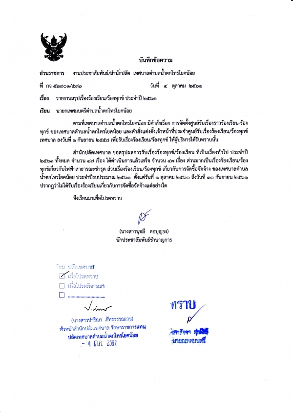 งานประชาสัมพันธ์ สำนักปลัดเทศบาล ขอสรุปผลการรับเรื่องร้องเรียน/ร้องทุกข์ ของเทศบาลตำบลน้ำตกไทรโยคน้อย ประจำปีงบประมาณ 2561 ตั้งแต่วันที่ 1 ตุลาคม 2561 ถึงวันที่ 30 กันยายน 2561 รายละเอียดตามเอกสารที่แนบมานี้....