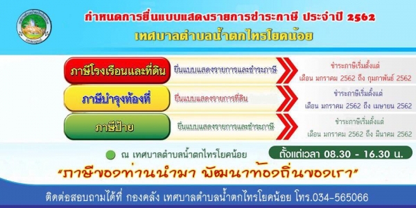 เทศบาลตำบลน้ำตกไทรโยคน้อย ขอประชาสัมพันธ์การยื่นแบบชำระภาษี โดยมีรายละเอียดดังนี้