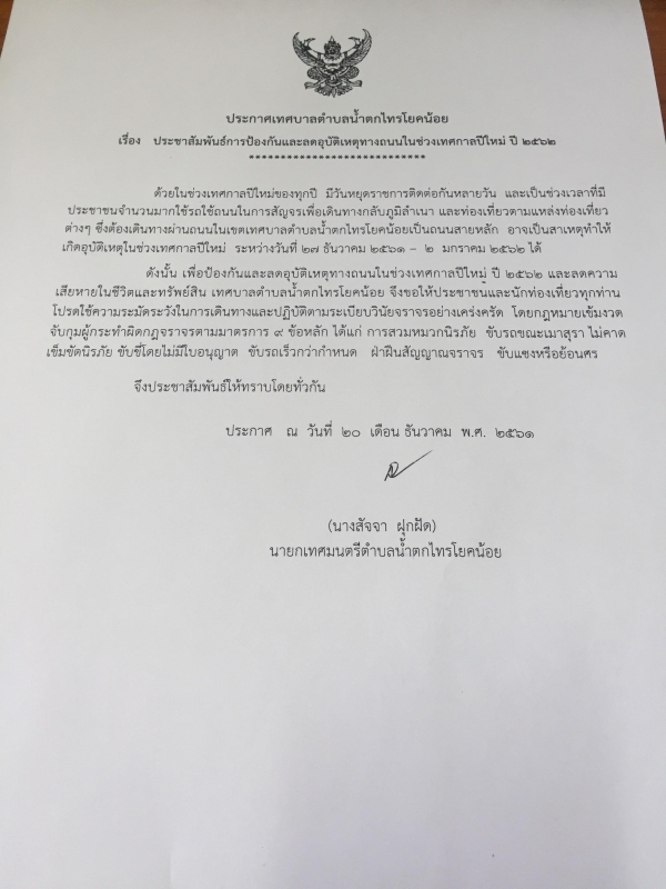 ช่วงเทศกาลปีใหม่ที่มีวันหยุดติดต่อกันหลายวัน เป็นช่วงที่ประชาชนเดินทางไปท่องเที่ยวและกลับภูมิลำเนาของตนเอง ทำให้ปริมาณการใช้รถใช้ถนนเพิ่มมากขึ้นจากเดิม และทำให้มีสถิติการเกิดอุบัติเหตุมากขึ้น เทศบาลตำบลน้ำตกไทรโยคน้อยจึงขอให้ประชาชนและนักท่องเที่ยวทุกท่านโปรดใช้ความระมัดระวังในการเดินทางและปฏิบัติตามระเบียบวินัยจราจรอย่างเคร่งครัด และขอให้ทุกท่านเดินทางอย่างปลอดภัยในช่วงเทศกาลปีใหม่ **ด้วยความปรารถนาดีจาก เทศบาลตำบลน้ำตกไทรโยคน้อย ** (ขอบคุณสื่อประชาสัมพันธ์จาก สสส.)