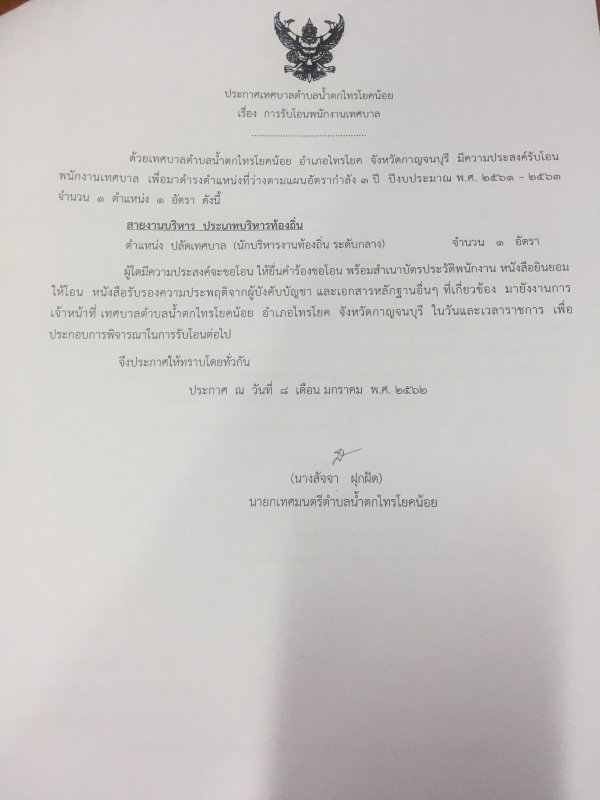 เทศบาลตำบลน้ำตกไทรโยคน้อย แจ้งประชาสัมพันธ์การรับโอนพนักงานเทศบาล สายงานผู้บริหาร ประเภทบริหารท้องถิ่น ตำแหน่ง ปลัดเทศบาล (นักบริหารงานท้องถิ่นระดับกลาง) จำนวน 1 อัตรา หากผู้ใดมีความประสงค์จะขอโอน ให้ยื่นคำร้องขอโอน มายังงานการเจ้าหน้าที่ เทศบาลตำบลน้ำตกไทรโยคน้อย หรือโทรสอบถามรายละเอียดเพิ่มเติมเบอร์ 034-565066