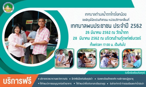 เทศบาลขอเชิญรับบริการ หน่วยบริการเคลื่อนที่ “เทศบาลพบประชาชน ประจำปี 2562” ในวันอังคาร ที่ 26 มีนาคม 2562 ณ วัดน้ำตก และ วันพฤหัสบดี ที่ 28 มีนาคม 2562 ณ บริเวณร้านตุ๊ดแก่แซ่บเวอร์ ตั้งแต่เวลา 17.00 น. เป็นต้นไป ซึ่งสามารถรับบริการด้านต่างๆ อาทิเช่น บริการคัดกรองสุขภาพ ฉีดวัคซีนสัตว์เลี้ยง รับให้คำปรึกษาในเรื่องต่างๆ ของงานเทศบาล จึงขอแจ้งประชาสัมพันธ์ประชาชนในเขตเทศบาลร่วมกิจกรรมบริการดีๆ ถึงบ้าน จากเทศบาลตำบลน้ำตกไทรโยคน้อยโดยพร้อมเพรียงกัน