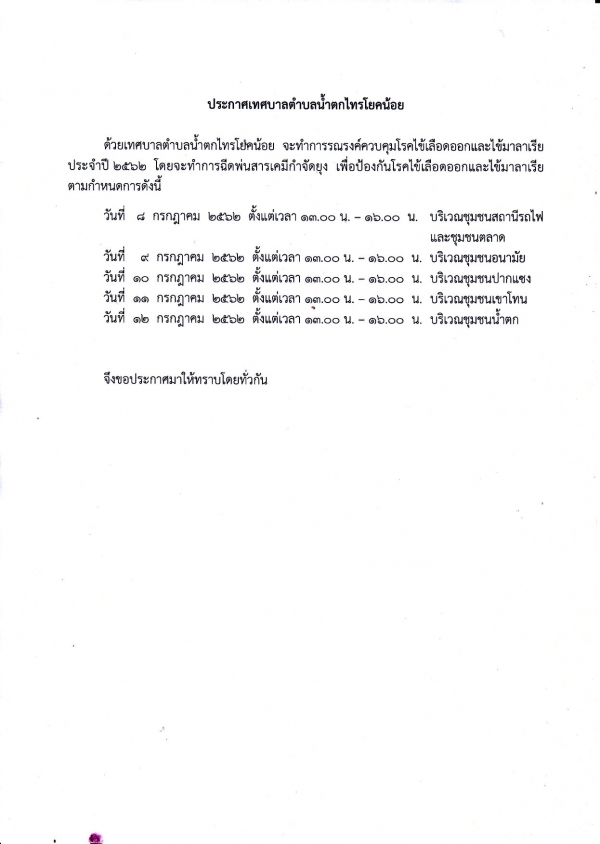 งานสาธารณสุขและสิ่งแวดล้อม เทศบาลตำบลน้ำตกไทรโยคน้อย พร้อมด้วยกลุ่ม อสม. เทศบาลฯ กำหนดลงพื้นที่ฉีดพ่นหมอกควันกำจัดยุงภายในบ้านเรื่อนประชาชน ในเดือนกรกฎาคม 2562 โดยมีกำหนดการดังเอกสารด้านล่าง จึงขอแจ้งประชาชนเตรียมสถานที่ก่อนออกพ่นหมอกควันดังต่อไปนี้