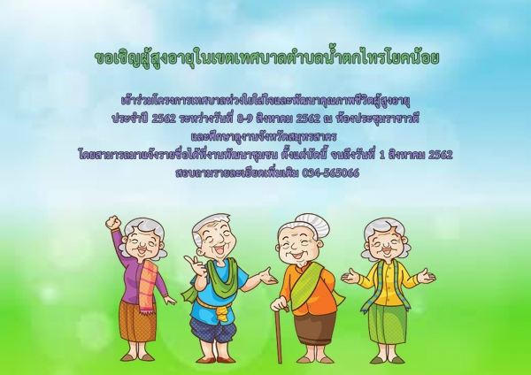 ขอเชิญท่านผู้สูงอายุเข้าร่วมโครงการเทศบาลห่วงใยใส่ใจและพัฒนาคุณภาพชีวิตผู้สูงอายุ ประจำปี 2562