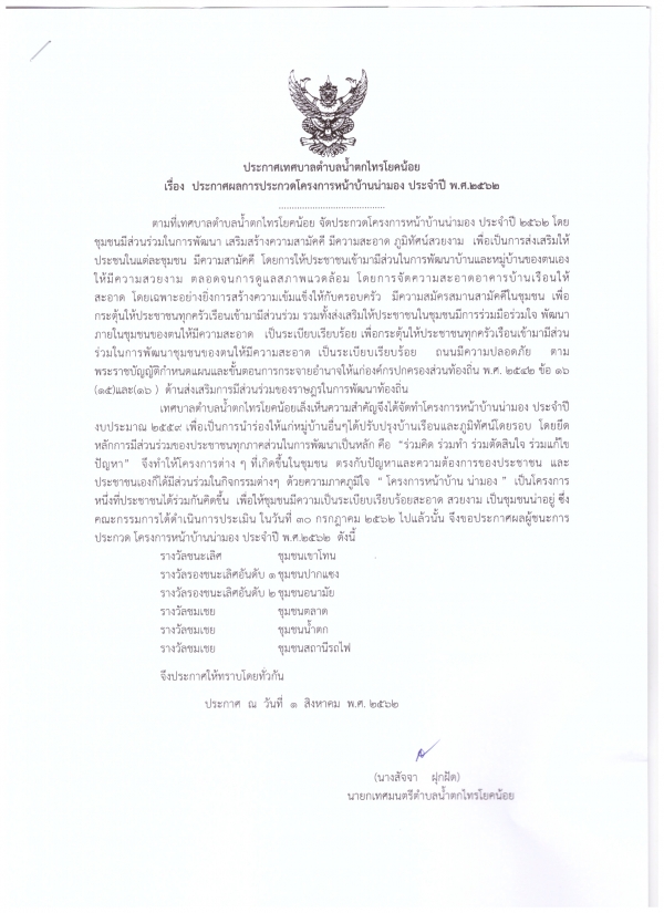 ประกาศผลการประกวดโครงการหน้าบ้านน่ามอง ประจำปีงบประมาณ พ.ศ.2562