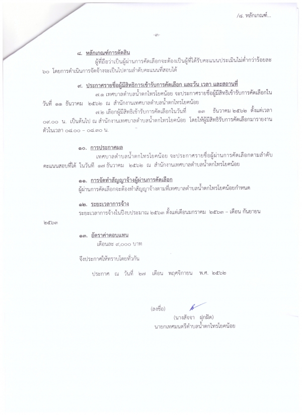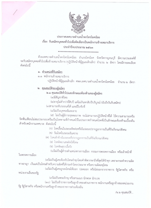 ประกาศเทศบาลตำบลน้ำตกไทรโยคน้อย เรื่อง รับสมัครบุคคลทั่วไปเพื่อคัดเลือกเป็นพนักงานจ้างเหมาบริการ ประจำปีงบประมาณ 2563 โดยมีความประสงค์ที่จะรับสมัครบุคคลทั่วไปเพื่อจ้างเหมาบริการ (ปฏิบัติหน้าที่ผู้ดูแลเด็กเล็ก) จำนวน 2 อัตรา ผู้ประสงค์จะสมัครยื่นใบสมัครด้วยตนเอง ได้ที่งานการศึกษา สำนักปลัดเทศบาล ตั้งแต่วันที่ 2 - 6 ธันวาคม 2562 (ในวัน และเวลาราชการ) โดยมีรายละเอียดตามเอกสารแนบท้ายประกาศนี้