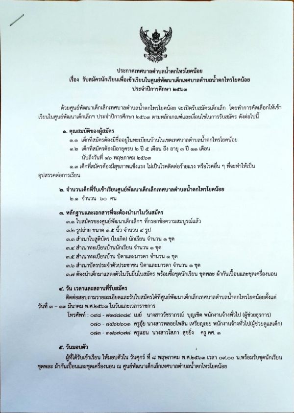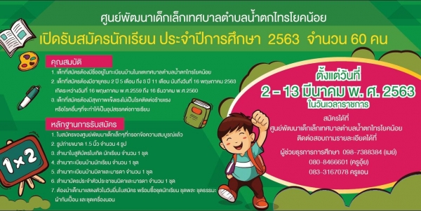 รับสมัครนักเรียนเพื่อเข้าเรียนในศูนย์พัฒนาเด็กเล็กเทศบาลตำบลน้ำตกไทรโยคน้อย ประจำปีการศึกษา 2563