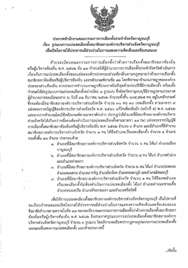 แจ้งประชาสัมพันธ์การแบ่งเขตการเลือกตั้งสมาชิกสภาองค์การบริหารส่วนจังหวัดกาญจนบุรี