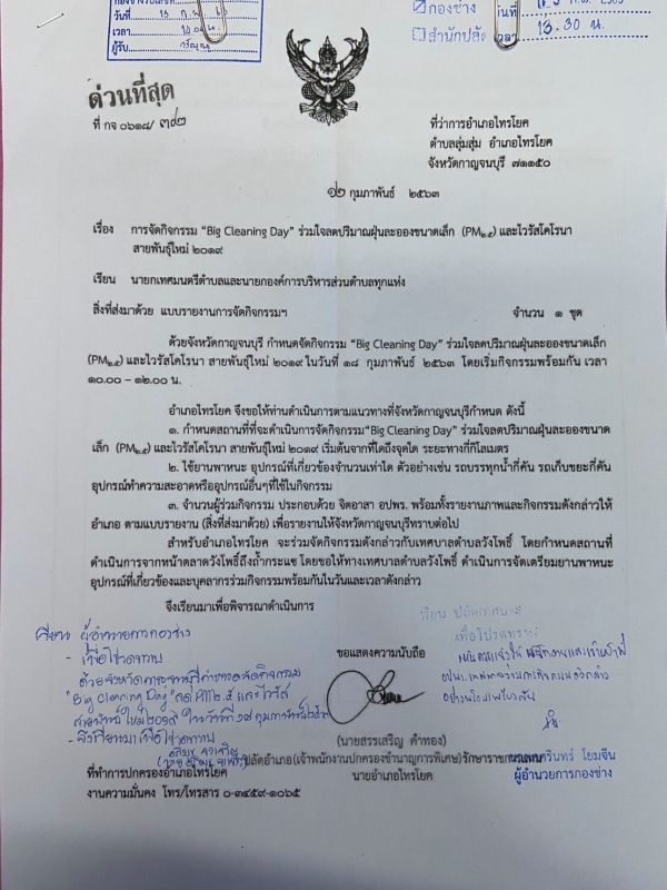 ขอเชิญชวนเข้าร่วมกิจกรรม Big Cleaning Day ร่วมใจลดประมาณฝุ่นละอองขนาดเล็ก (PM2.5) และไวรัสโคโรนาสายพันธุ์ใหม่ 2019