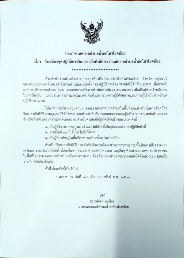 รับสมัครชุดปฏิบัติการจิตอาสาภัยพิบัติประจำเทศบาลตำบลน้ำตกไทรโยคน้อย