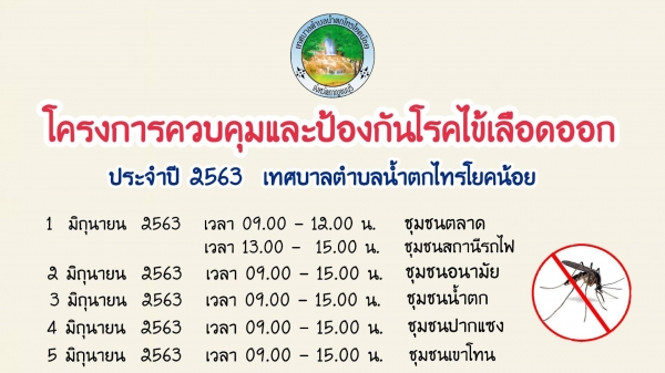 ด้วยเทศบาลตำบลน้ำตกไทรโยคน้อย ได้กำหนดออกหน่วยเคลื่อนที่ควบคุม ป้องกันโรคไข้เลือดออก โดยดำเนินการฉีดพ่นหมอกควัน