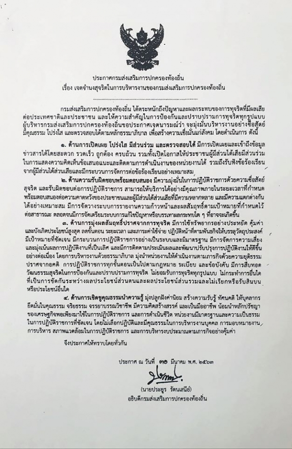 แจ้งประกาศเจตจำนงสุจริตในการบริหารงานของกรมส่งเสริมการปกครองท้องถิ่น