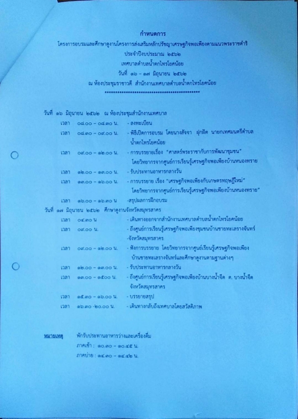 ระหว่างวันที่ 16-17 มิถุนายน 2562 ณ ห้องประชุมราชาวดี เทศบาลตำบลน้ำตกไทรโยคน้อย เริ่มลงทะเบียนตั้งแต่เวลา 08.00 น.