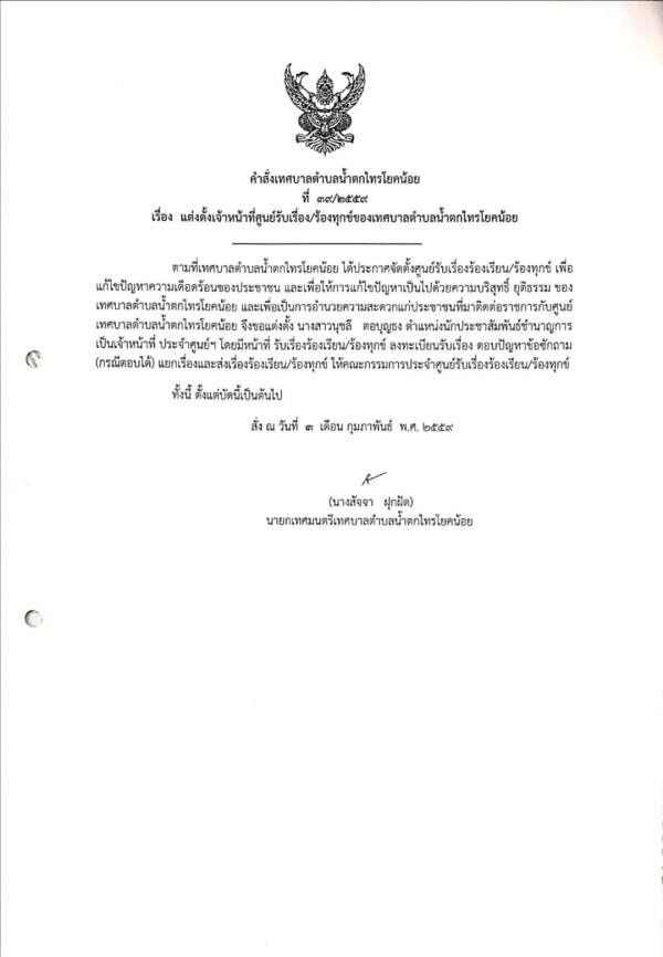 คำสั่งแต่งตั้งเจ้าหน้าที่ศูนย์รับเรื่อง/ร้องทุกข์ของเทศบาลตำบลน้ำตกไทรโยคน้อย