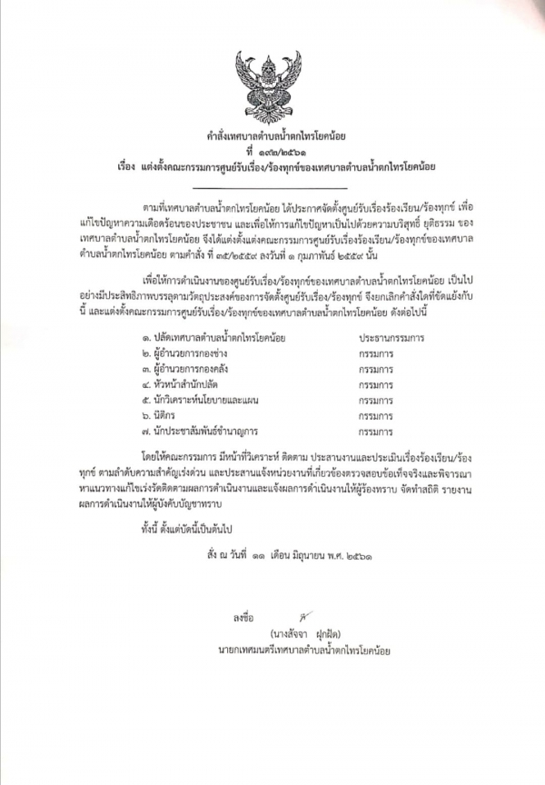 แต่งตั้งคณะกรรมการศูนย์รับเรื่องร้องเรียน/ร้องทุกข์ เทศบาลตำบลน้ำตกไทรโยคน้อย