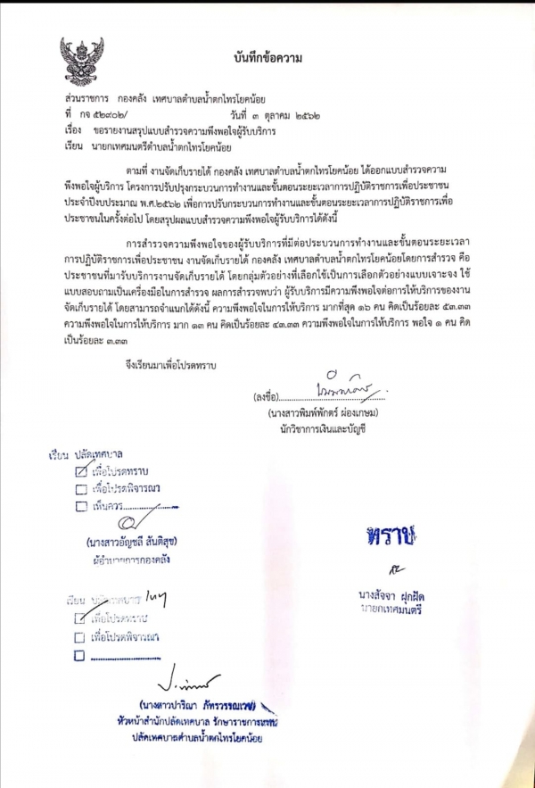 ตามที่ งานจัดเก็บรายได้ กองคลัง เทศบาลตำบลน้ำตกไทรโยคน้อย ได้ออกแบบสำรวจความพึงพอใจผู้บริการ โครงการปรับปรุงกระบวนการทำงานและขั้นตอนระยะเวลาการปฏิบัติราชการเพื่อประชาชน ประจำปี 2562 เพื่อการปรับปรุงการทำงานและขั้นตอนระยะเวลาการปฏิบัติราชการเพื่อประชาชนในครั้งต่อไป โดยสรุปผลแบบสำรวจความพึงพอใจผู้รับบริการตามเอกสารที่แนบมานี้