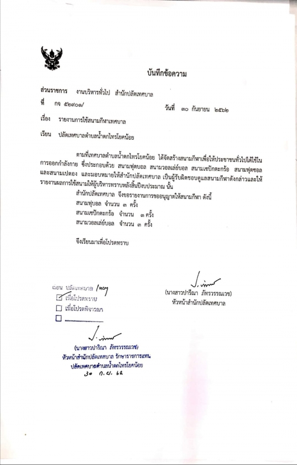 ตามที่เทศบาลตำบลน้ำตกไทรโยคน้อย ได้จัดสร้างสนามกีฬาเพื่อให้ประชาชนทั่วไปได้ใช้ในการออกกำลังกาย ซึ่งประกอบด้วย สนามฟุตบอล สนามวอลเล่ย์บอล สนามเซปักตะกร้อ สนามฟุตซอล และสนามเปตอง และมอบหมายให้สำนักปลัดเทศบาล เป็นรับผิดชอบดูแลสนามกีฬาดังกล่าวและให้ รายงานผลการใช้สนามให้ผู้บริหารทราบหลังสิ้นปีงบประมาณ รายละเอียดตามเอกสารนี้