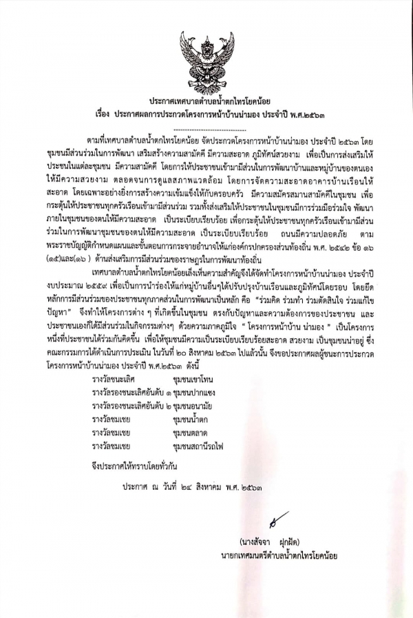นั้น เทศบาลจึงขอประกาศผลผู้ชนะการประกวดโครงการหน้าหน้ามอง ดังเอกสารด้านล่างนี้