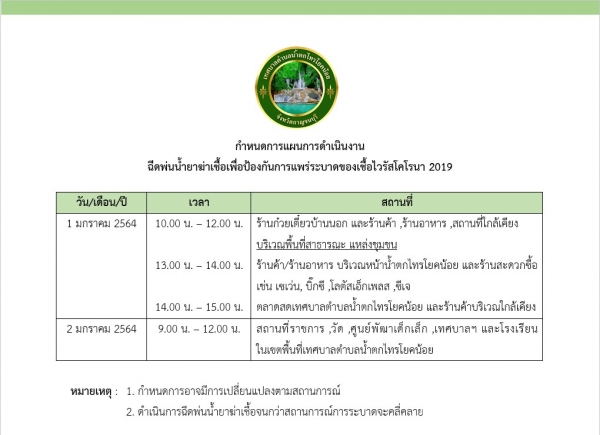 กำหนดการแผนการดำเนินการฉีดพ่นน้ำยาฆ่าเชื้อเพื่อป้องกันการแพร่ระบาดของเชื้อไวรัสโคโรน่า 2019