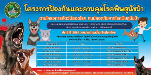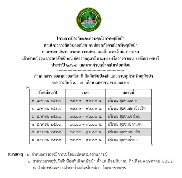 แจ้งประชาสัมพันธ์กำหนดการออกหน่วยเคลื่อนที่ ฉีดวัคซีนป้องกันและควบคุมโรคพิษสุนัขบ้า ระหว่างวันที่ 1-9 เมษายน 2564 ในโครงการป้องกันและควบคุมโรคพิษสุนัขบ้าในสุนัขและแมว ตามปณิธาน ศาสตราจารย์ ดร.สมเด็จพระเจ้าน้องนางเธอ เจ้าฟ้าหญิงจุฬาภรณวลัยลักษณ์ อัครราชกุมารี กรมพระศรีสวางควัฒน วรขัติยราชนารี ประจำปี 2564 เทศบาลตำบลน้ำตกไทรโยคน้อย