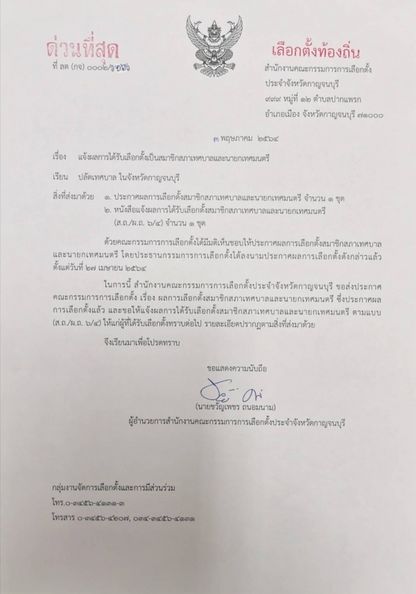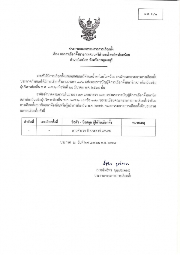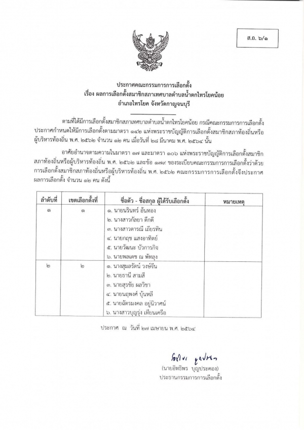 แจ้งประกาศคณะกรรมการการเลือกตั้ง เรื่อง ผลการเลือกตั้งสมาชิกสภาเทศบาลและนายกเทศมนตรีตำบลน้ำตกไทรโยคน้อย