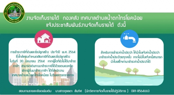 แจ้งข่าวประชาสัมพันธ์ จากงานจัดเก็บรายได้ กองคลัง เทศบาลตำบลน้ำตกไทรโยคน้อย 2 เรื่องดังนี้