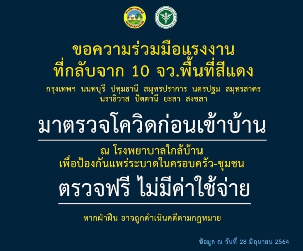 กลุ่มแรงงานที่กลับจากพื้นที่ 10 จังหวัดให้ตรวจโควิดก่อนกลับเข้าบ้าน ตรวจฟรีไม่มีค่าใช้จ่าย