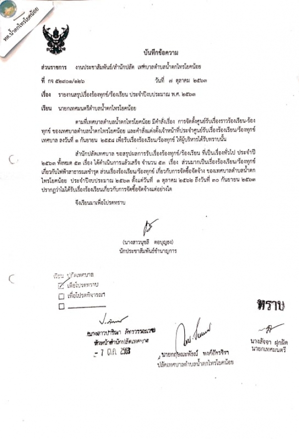 สำนักปลัดเทศบาล ขอสรุปผลการรับเรื่องร้องทุกข์/ร้องเรียน ที่เป็นเรื่องทั่วไป ประจำปี 2563 ทั้ง 63 เรื่อง ได้ดำเนินการแล้วเสร็จ จำนวน 53 เรื่อง ส่วนมาเป็นเรื่องร้องเรียนทุกข์/ร้องเรียนเกี่ยวกับไฟฟ้าสาธารณะชำรุด ส่วนเรื่องร้องทุกข์/ร้องเรียน เกี่ยวกับการจัดซื้อจัดจ้าง ของเทศบาลตำบลน้ำตกไทรโยคน้อย ประจำปีงบประมาณ 2563 ตั้งแต่วันที่ 1 ตุลาคม 2562 ถึงวันที่ 30 กันยสยน 2563 ปรากฎว่าไม่ได้รับเรื่องร้องเรียนเกี่ยวกับการจัดซื้อจัดจ้างแต่อย่างใด