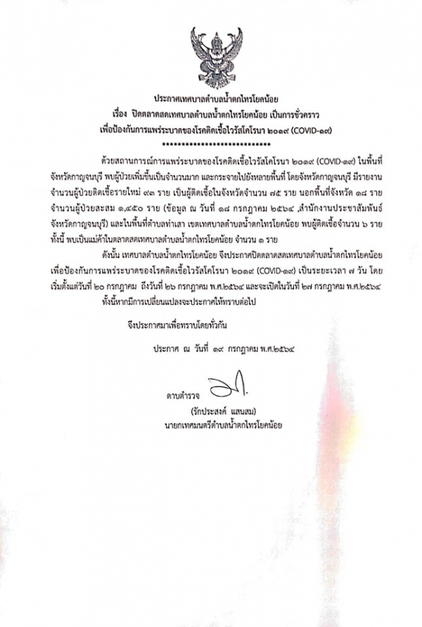หลังพบผู้ติดเชื้อโควิด-19 ซึ่งเกี่ยวข้องกับผู้ค้าในตลาดสดเทศบาล โดยจะปิดตลาดตั้งแต่วันที่ 20 - 26 กรกฎาคม 2564 รวมเวลา 7 วัน ตามมาตรการป้องกันโควิด-19 และทางเทศบาลได้ดำเนินการล้างทำความสะอาดพื้นที่แผงค้าและบริเวณโดยรอบด้วยน้ำยาฆ่าเชื้อ เพื่อเป็นการป้องกันและเฝ้าระวังการแพร่ระบาดของไวรัสโควิด