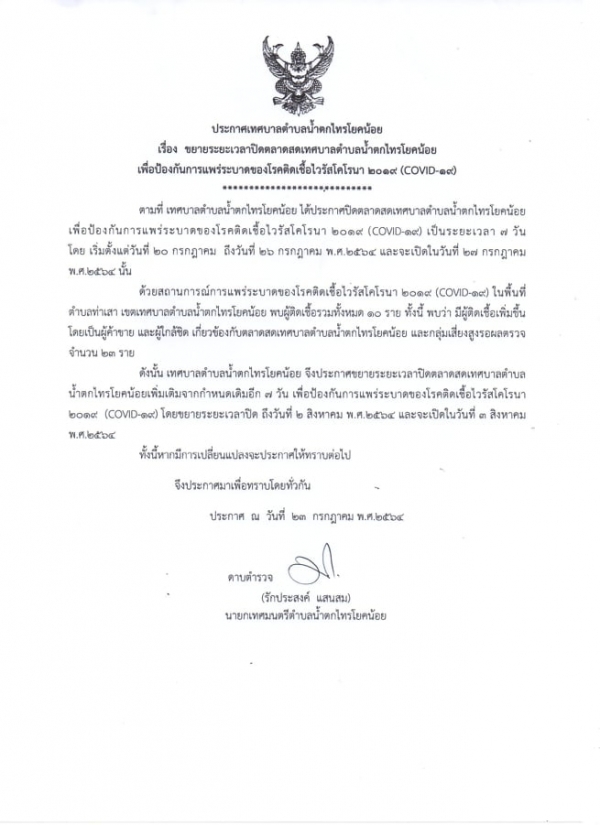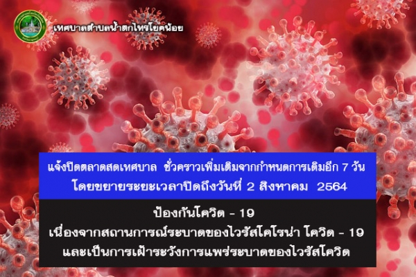 ดังนั้นจำเป็นต้องขยายระยะเวลาการปิดตลาดสดเทศบาล เพิ่มเติมจากกำหนดการเดิมอีก 7 วัน โดยขยายเวลาปิด ถึงวันที่ 2 สิงหาคม 2564 และจะเปิดในวันที่ 3 สิงหาคม 2564 ตามมาตรการป้องกันโควิด-19 และทางเทศบาลได้ดำเนินการล้างทำความสะอาดพื้นที่แผงค้าและบริเวณโดยรอบด้วยน้ำยาฆ่าเชื้อ เพื่อเป็นการป้องกันและเฝ้าระวังการแพร่ระบาดของไวรัสโควิด หากมีการเปลี่ยนแปลงจะแจ้งให้ทราบต่อไป