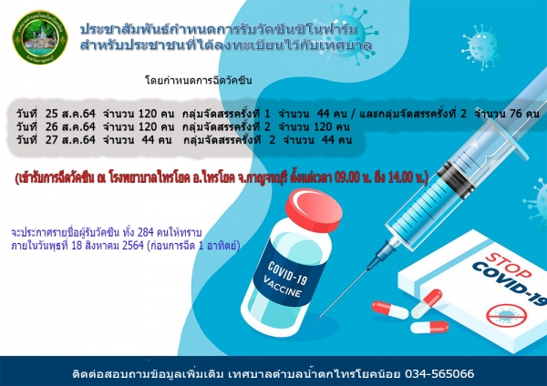 ตามที่เทศบาลตำบลน้ำตกไทรโยคน้อย ได้เเจ้งความประสงค์ขอรับการจัดสรรค์วัคซีน ซิโนฟาร์ม กับทางราชวิทยาลัยจุฬาภรณ์ จำนวน 336 คน ตามจำนวนประชาชนที่ได้ลงทะเบียน +10% เพื่อผู้ด้อยโอกาส