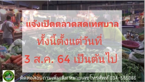 แจ้งเปิดตลาดสดเทศบาล ทั้งนี้ตั้งแต่วันที่ 3 สิงหาคม 2564 เป็นต้นไป