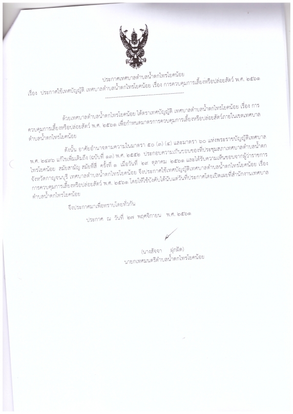 ประกาศใช้ เทศบัญญัติ เรื่อง การควบคุมการเลี้ยงหรือการปล่อยสัตว์ พ.ศ.2561