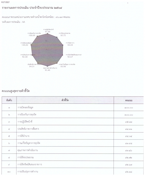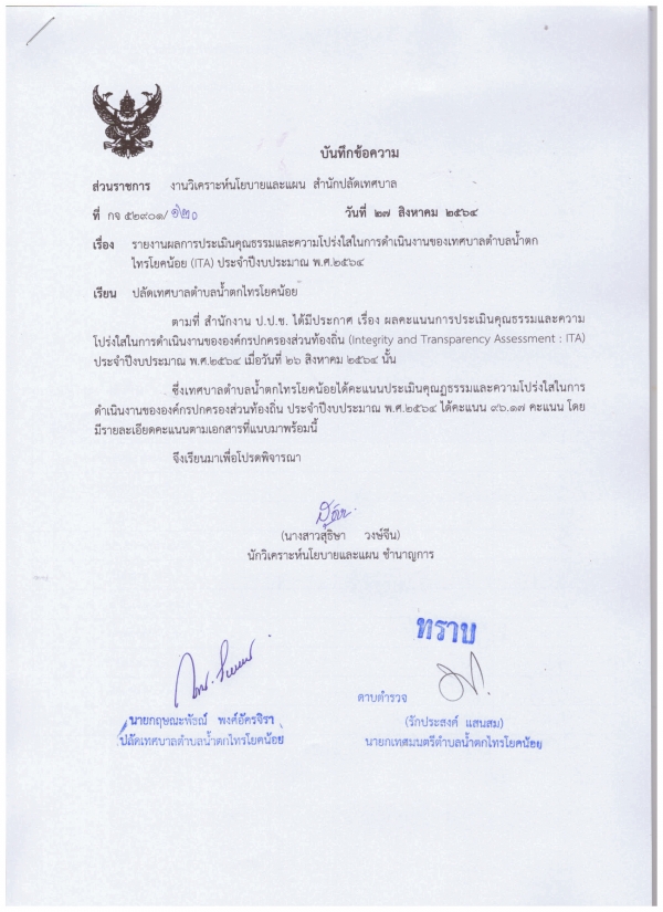 ซึ่งเทศบาลตำบลน้ำตกไทรโยคน้อยได้คะแนนประเมินคุณฏธรรมและความโปร่งใสในการดำเนินงานขององค์กรปกครองส่วนท้องถิ่น ประจำปีงบประมาณ พ.ศ.2564 ได้คะแนน 96.17 คะแนน โดยมีรายละเอียดคะแนนตามเอกสารที่แนบมาพร้อมนี้