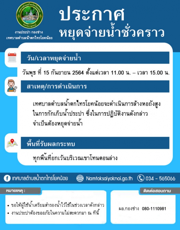 งานประปาเทศบาลตำบลน้ำตกไทรโยคน้อย จะดำเนินการล้างหอถังสูงซึ่งใช้กักเก็บน้ำประปา โดยในการปฏิบัติงานดังกล่าว จำเป็นต้องหยุดจ่ายน้ำในทุกพื้นที่