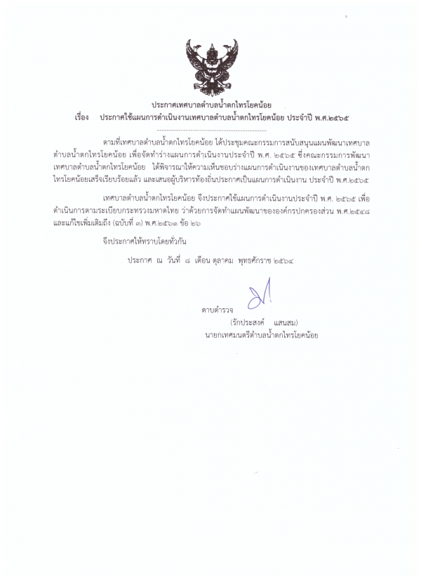 ตามที่เทศบาลตำบลน้ำตกไทรโยคน้อย ได้ประชุมคณะกรรมการสนับสนุนแผนพัฒนาเทศบาลตำบลน้ำตกไทรโยคน้อย เพื่อจัดทำร่างแผนการดำเนินงานประจำปี พ.ศ. 2565 ซึ่งคณะกรรมการพัฒนาเทศบาลตำบลน้ำตกไทรโยคน้อย ได้พิจารณาให้ความเห็นชอบร่างแผนการดำเนินงานของเทศบาลตำบลน้ำตกไทรโยคน้อยเสร็จเรียบร้อยแล้ว และเสนอผู้บริหารท้องถิ่นประกาศเป็นแผนการดำเนินงาน ประจำปี พ.ศ.2565