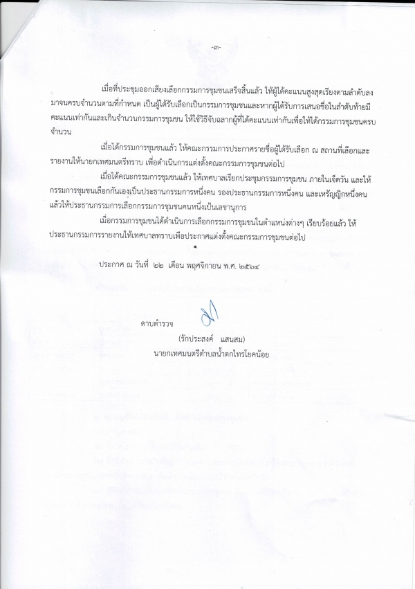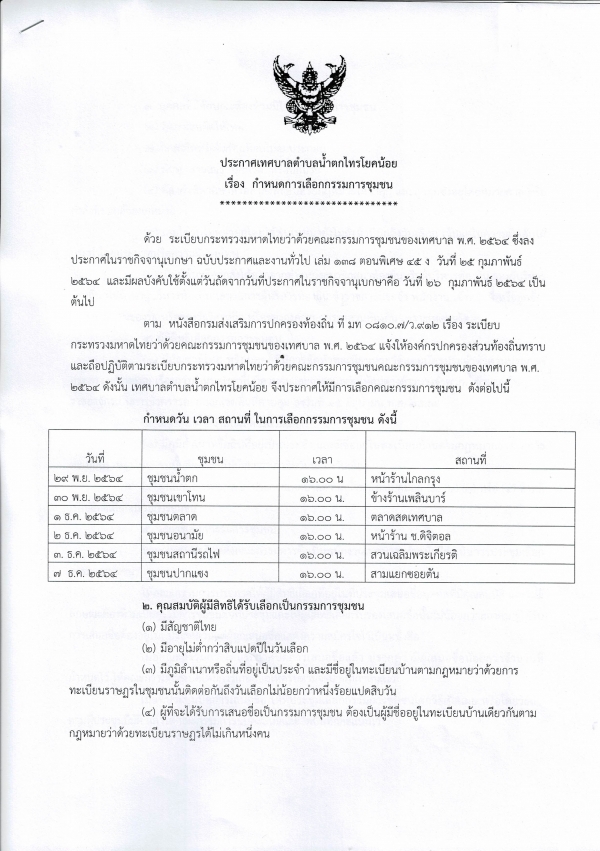 ประกาศเทศบาลตำบลน้ำตกไทรโยคน้อย เรื่อง กำหนดการเลือกกรรมการชุมชน