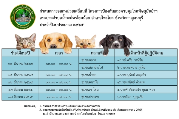กำหนดการออกหน่วยเคลื่อนที่ โครงการป้องกันและควบคุมโรคพิษสุนัขบ้าฯ เทศบาลตำบลน้ำตกไทรโยคน้อย ประจำปีงบประมาณ 2565