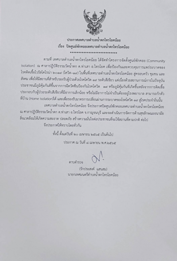 ตามที่เทศบาลตำบลน้ำตกไทรโยคน้อย ได้จัดตั้งศูนย์พักคอย (Community Isolation) ณ ศาลาปฏิบัติวัดน้ำตก ตำบลท่าเสา อำเภอไทรโยค จังหวัดกาญจนบุรี นั้น แต่เนื่องด้วยสถานการณ์ในปัจจุบันประชาชนมีภูมิคุ้มกันดีขึ้นจากการฉีดวัคซีนป้องกันโรคโควิด 19 ประกอบกับผู้ผ่วยสีเขียสมีอาการเล็กน้อย หรือไม่มีอาการและไม่จำเป็นต้องอยู่โรงพยาบาล สามารถกักตัวที่บ้าน (Home Isolation) ได้ และเพื่อรองรับมาตรการเปลี่ยนผ่านการระบาดของโรคโควิด 19 สู่โรคประจำถิ่น
