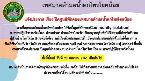 เทศบาลตำบลน้ำตกไทรโยคน้อย จึงขอประกาศปิดศูนย์พักคอย ณ ศาลาปฏิบัติธรรมวัดน้ำตก