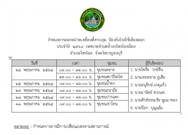 เทศบาลตำบลน้ำตกไทรโทรโยคย้อย ประชาสัมพันธ์กำหนดการโครงการควบคุมป้องกันโรคไข้เลือดออก ปีงบประมาณ 2564