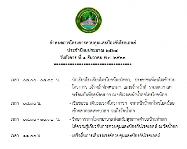 เทศบาลตำบลน้ำตกไทรโยคน้อย ประชาสำพันธ์กำหนดการโครงการควบคุมป้องกันโรคเอดส์ ประจำปีงบประมาณ 2564 และความรู้เรื่องโรคเอดส์