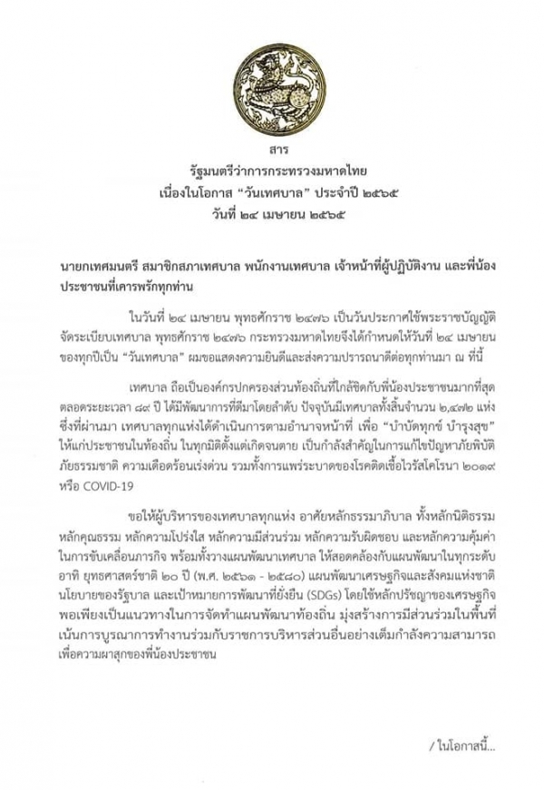 สารรัฐมนตรีว่าการกระทรวงมหาดไทย เนื่องในโอกาส "วันเทศบาล" ประจำปี 2565 วันที่ 24 เมษายน 2565