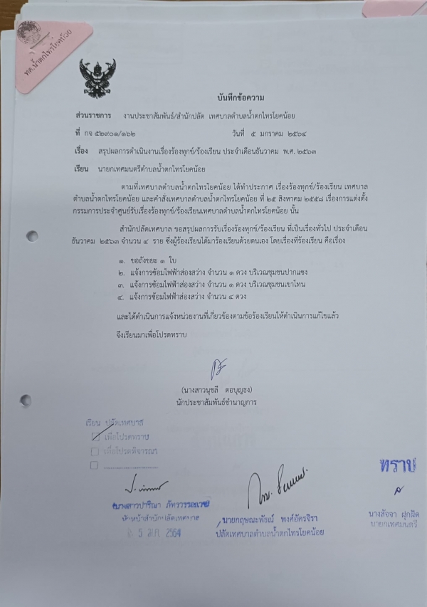งานประชาสัมพันธ์ สำนักปลัดเทศบาล ขอสรุปผลการรับเรื่องร้องเรียน/ร้องทุกข์ ของเทศบาลตำบลน้ำตกไทรโยคน้อย ประจำเดือนธันวาคม 2563 รายละเอียดตามเอกสารที่แนบมานี้....