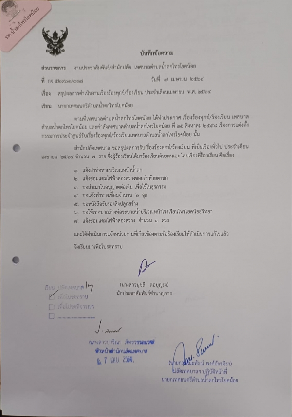 งานประชาสัมพันธ์ สำนักปลัดเทศบาล ขอสรุปผลการรับเรื่องร้องเรียน/ร้องทุกข์ ของเทศบาลตำบลน้ำตกไทรโยคน้อย ประจำเดือนมีนาคม 2564 รายละเอียดตามเอกสารที่แนบมานี้....