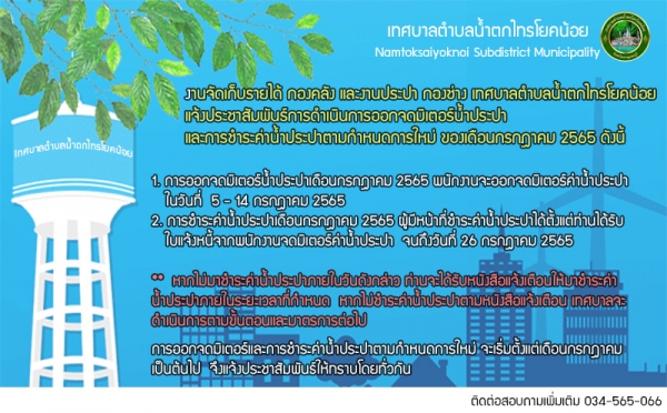 งานจัดเก็บรายได้ กองคลัง และงานประปา กองช่าง เทศบาลตำบลน้ำตกไทรโยคน้อย แจ้งประชาสัมพันธ์การดำเนินการออกจดมิเตอร์น้ำประปา และการชำระค่าน้ำประปาตามกำหนดการใหม่ ของเดือนกรกฎาคม 2565 ดังนี้