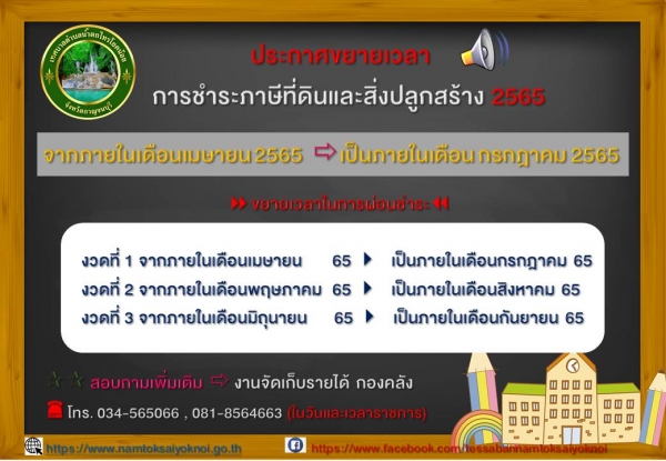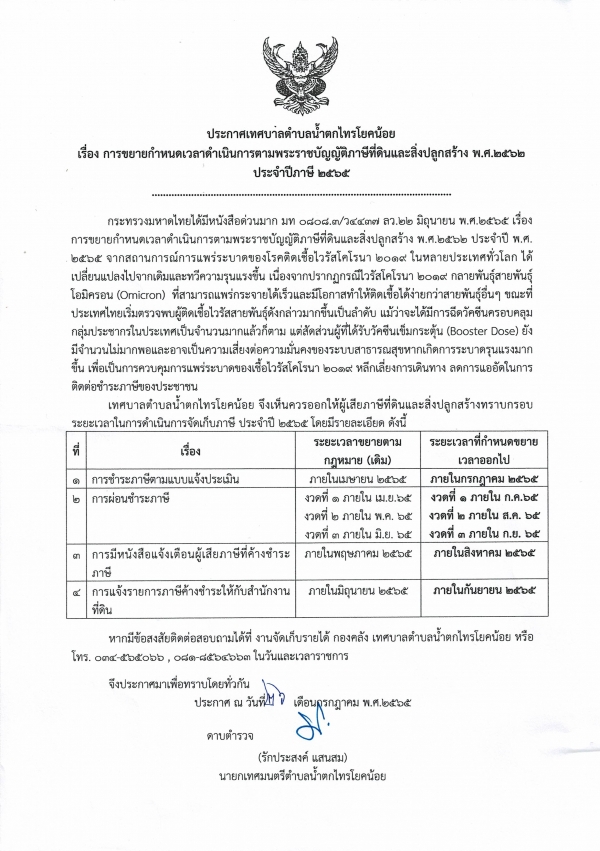 ประกาศขยายเวลาดำเนินการตามพระราชบัญญัติภาษีที่ดินและสิ่งปลูกสร้าง พ.ศ. 2562 ประจำปี 2565