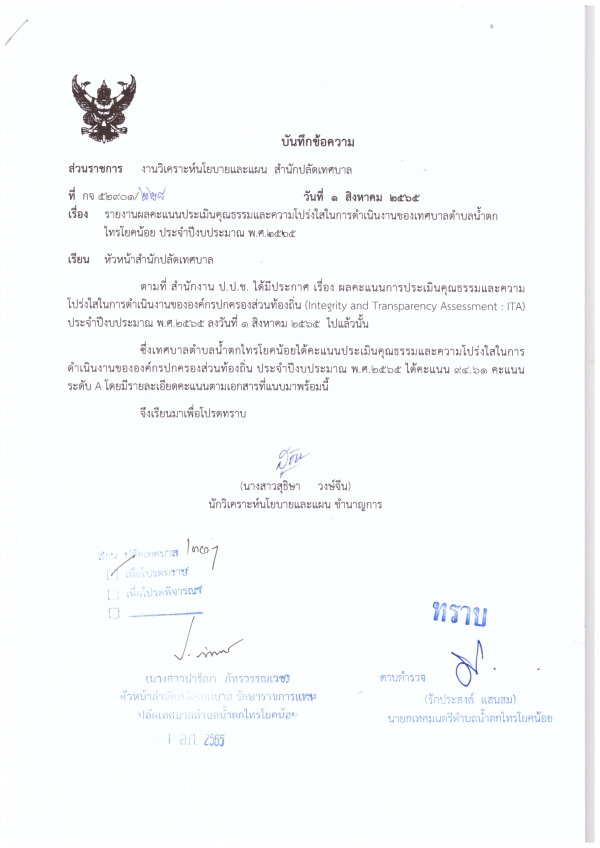ซึ่งเทศบาลตำบลน้ำตกไทรโยคน้อยได้คะแนนประเมินคุณธรรมและความโปร่งใสในการดำเนินงานขององค์กรปกครองส่วนท้องถิ่น ประจำปีงบประมาณ พ.ศ.2565 ได้คะแนน 94.61 คะแนน ระดับ A โดยมีรายละเอียดคะแนนตามเอกสารที่แนบมาพร้อมนี้