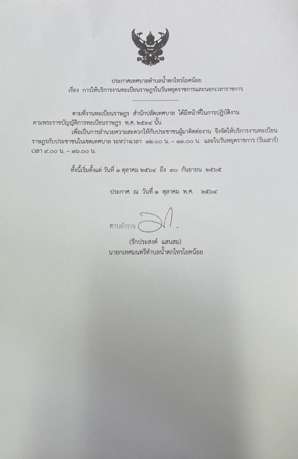 เพื่อเป็นการอำนวยความสะดวกให้กับประชาชนผู้มาติดต่องานระหว่าง เวลา 12.00 น. - 13.00 น. และในวันหยุดราชราชการ (วันเสาร์) เวลา 09.00 น. - 10.000 น.